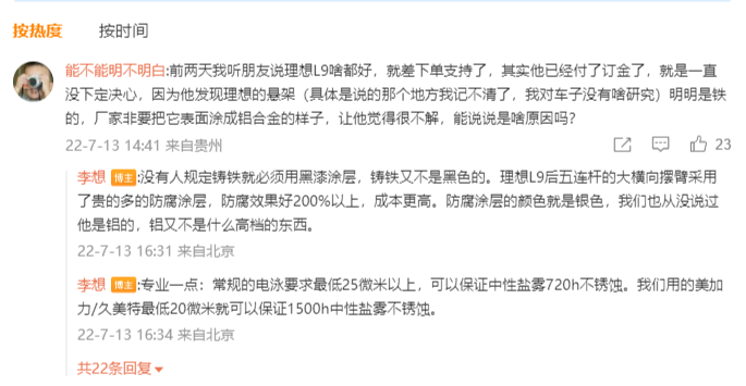 Event overviewSome netizens left a message under Li Xiang’s Weibo, saying that they found that the suspension of L9 was made of iron, but the manufacturer painted it like aluminum alloy, which made them feel puzzled. Then Li Xiang made a real name statement, and responded that "the cast iron didn’t stipulate that it must be coated with black paint, and the ideal L9 rear five-link big transverse swing arm adopted a much more expensive anti-corrosion coating, with a better anti-corrosion effect of more than 200% and higher cost. The color of the anticorrosive coating is silver, and we have never said that it is aluminum, and aluminum is not a high-end thing. "